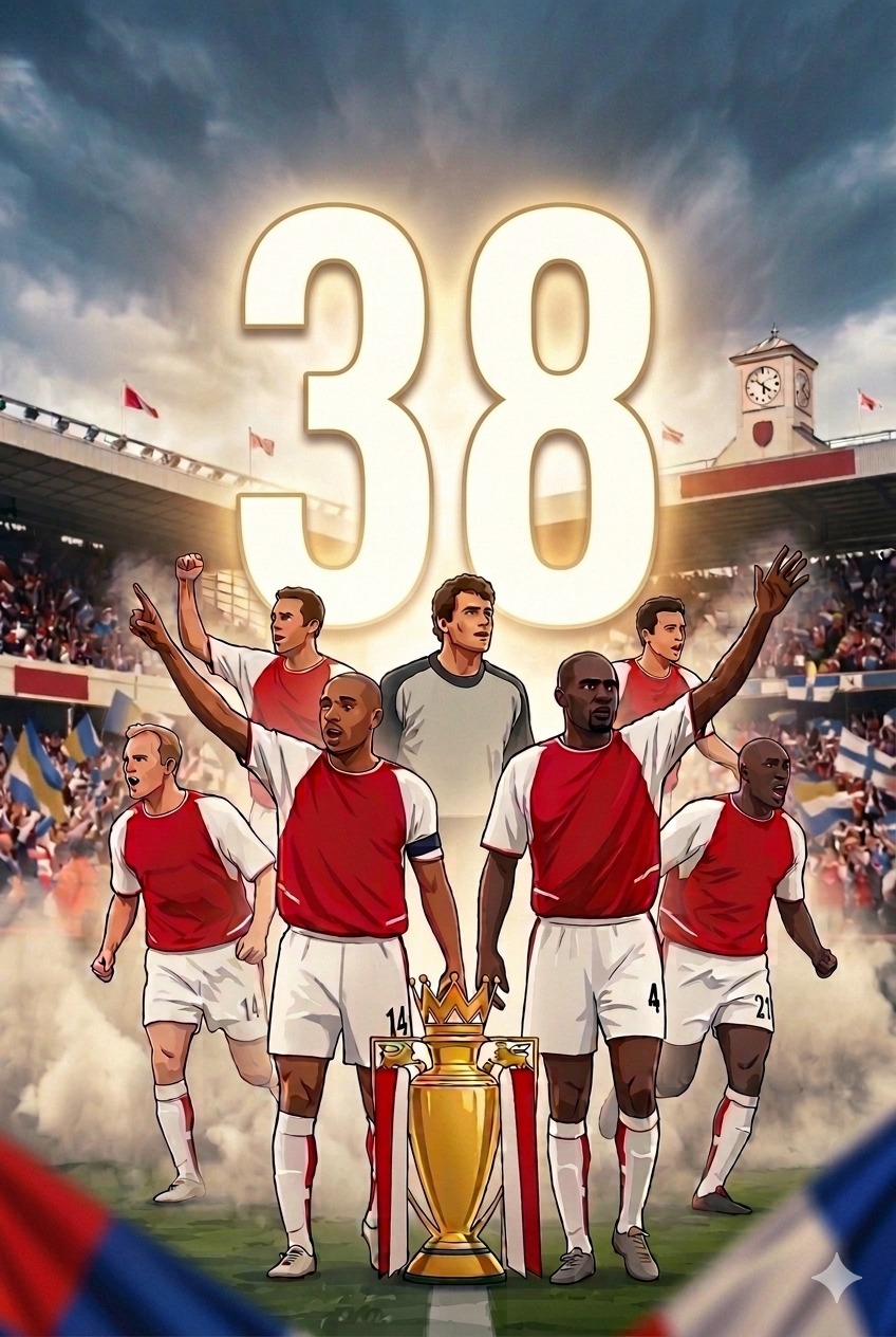 26 wins. 12 draws. 0 defeats. 90 points. 73 goals. 26 conceded.The only team in Premier League history to complete a full 38-game season unbeaten. Arsenal never trailed in the final 20 minutes of any of the 49 matches in their unbeaten run. "Not once defeated."